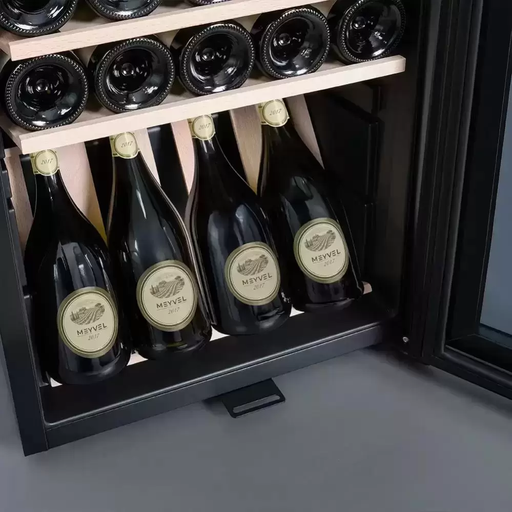 Винный холодильник Meyvel MV30-KBF1 имеет одну температурную зону, в которой можно разместить бутылки и единовременно выставить только одну комбинацию настроек. Он устанавливается отдельно, что удобно, если у вас есть специальное помещение — кладовая, погреб и т.д. Благодаря компактным размерам данная модель — отличный выбор для офиса, гостиничного номера. Количество бутылок, которое можно разместить с учетом полной комплектации и из расчета объема бутылки 0,75 л, — 30 шт.